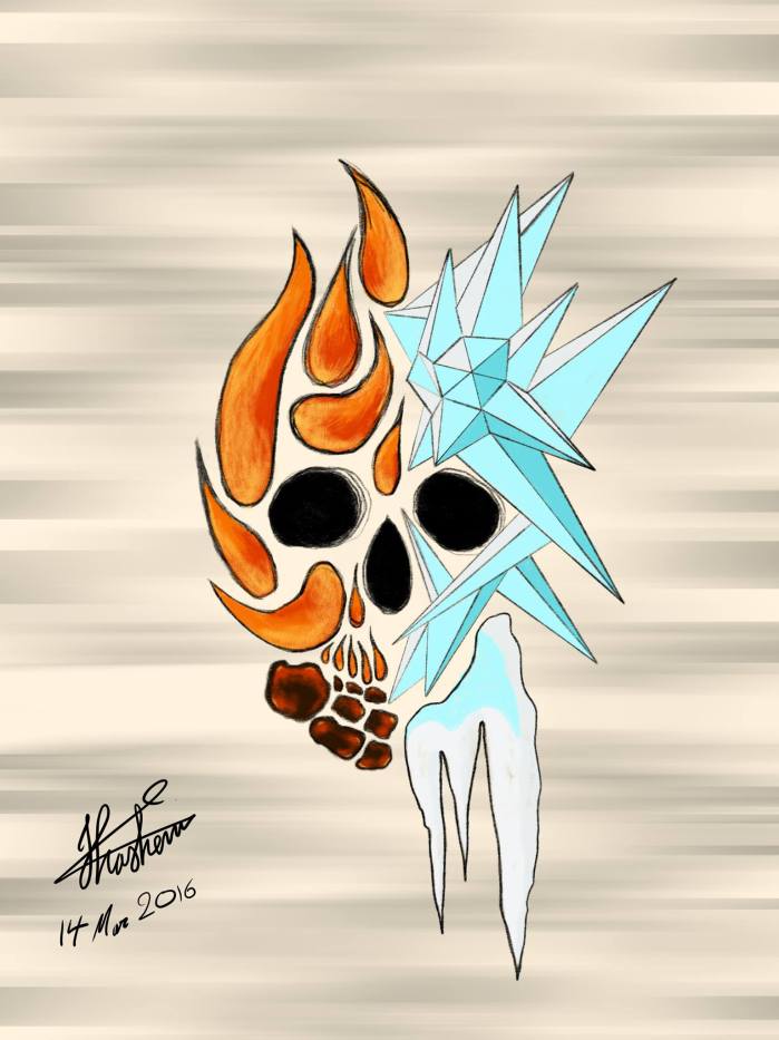 This illustration was an adventurous journey into uncharted creative territories, an endeavor to construct a striking paradox – a fusion of fire’s untamed energy with ice’s serene solidity. The skull, traditionally a symbol of mortality, is reborn in this juxtaposition, mirroring the eternal cycle of destruction and rebirth, heat and cold, chaos and tranquility.